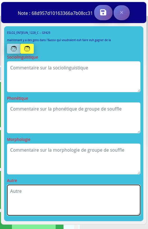Intégration de la saisie d’annotation sur les différents groupes de souffles sélectionnés. Quatre rubriques disponibles pour compléter les informations associées au groupe. Les annotations sont appariées à l’utilisateur, il est possible de cumuler les remarques et d’y accéder en lecture seule.